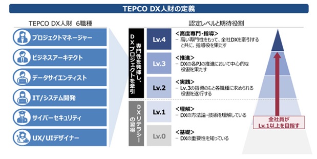 このうち、DXリテラシーの習得段階であるレベル1の到達基準に据えているのがiパス合格であり、全社員がレベル1以上を目指し、東京電力グループ横断で学習を後押ししています。